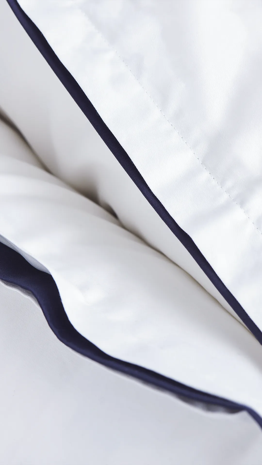 Örngott i satinvävd Giza 86-bomull med mjuk yta och handsydd navy blå kant. Hög trådtäthet och inbjudande design.
