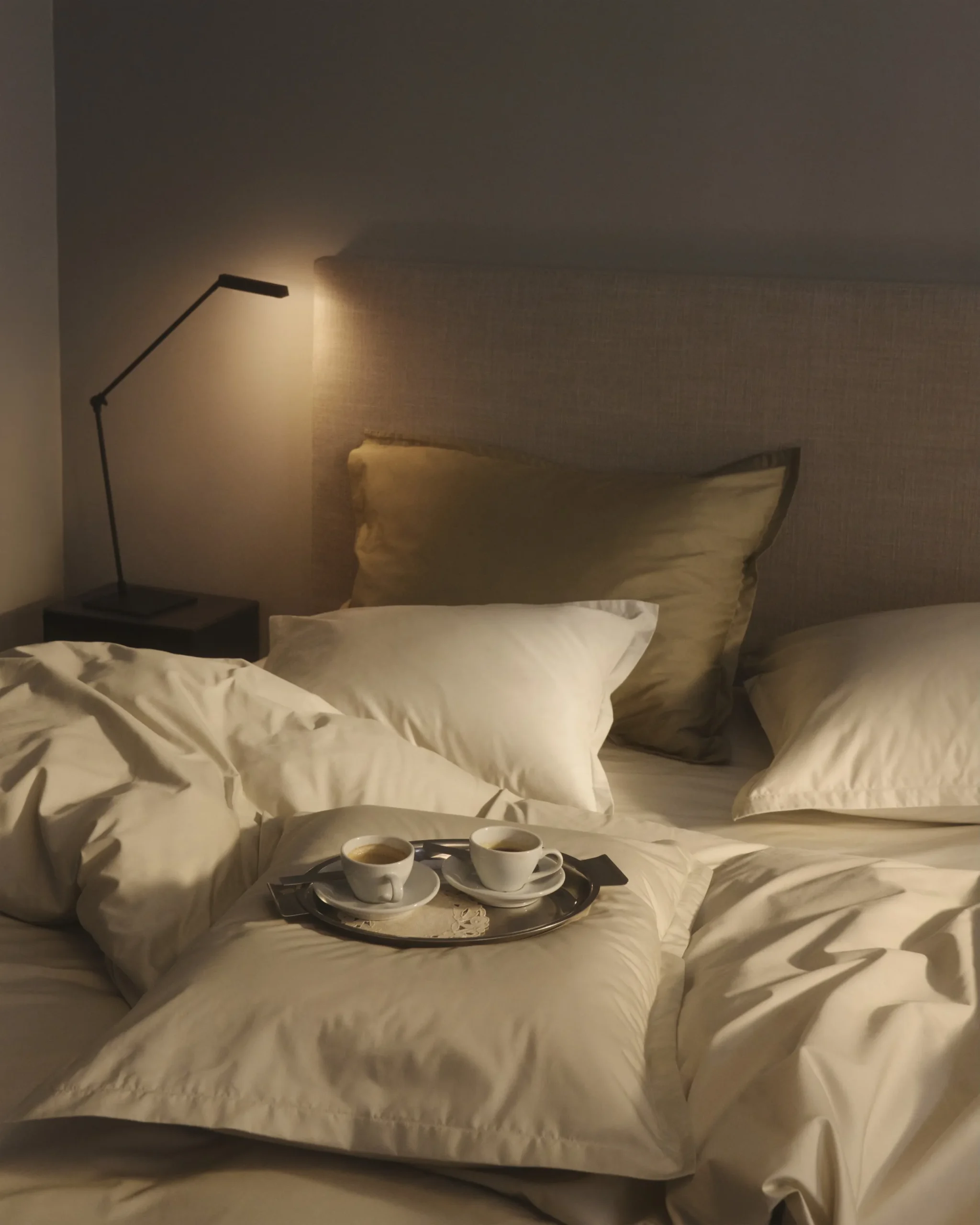 Shade Frame tillverkas i ekologisk ELS-bomull med satinbindning och 500 TC. ELS-fibrernas exceptionella längd möjliggör en tätare vävning och ger textilen ett diskret lyster, exceptionell hållbarhet och en känsla av substans. Tyget balanserar krispighet och mjukhet, en balans som Ogland arbetat länge med att uppnå.