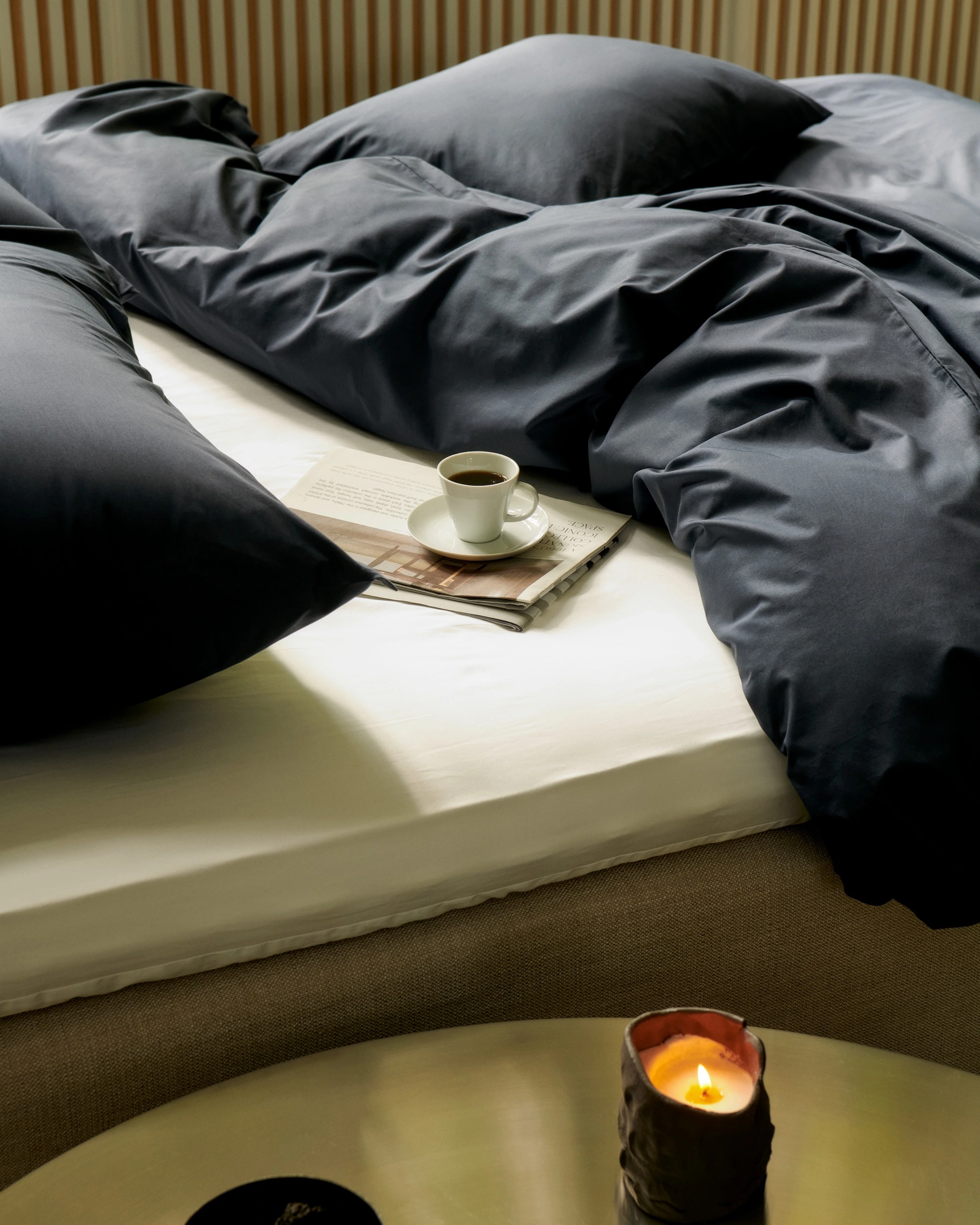 Påslakan i percale av biodynamisk Giza 86-bomull med 250 TC. Ett svalt alternativ för dig som föredrar en lätt och luftig känsla i sängen. Den djupblåa nyansen gör sovrummet extra ombonat och mysigt.